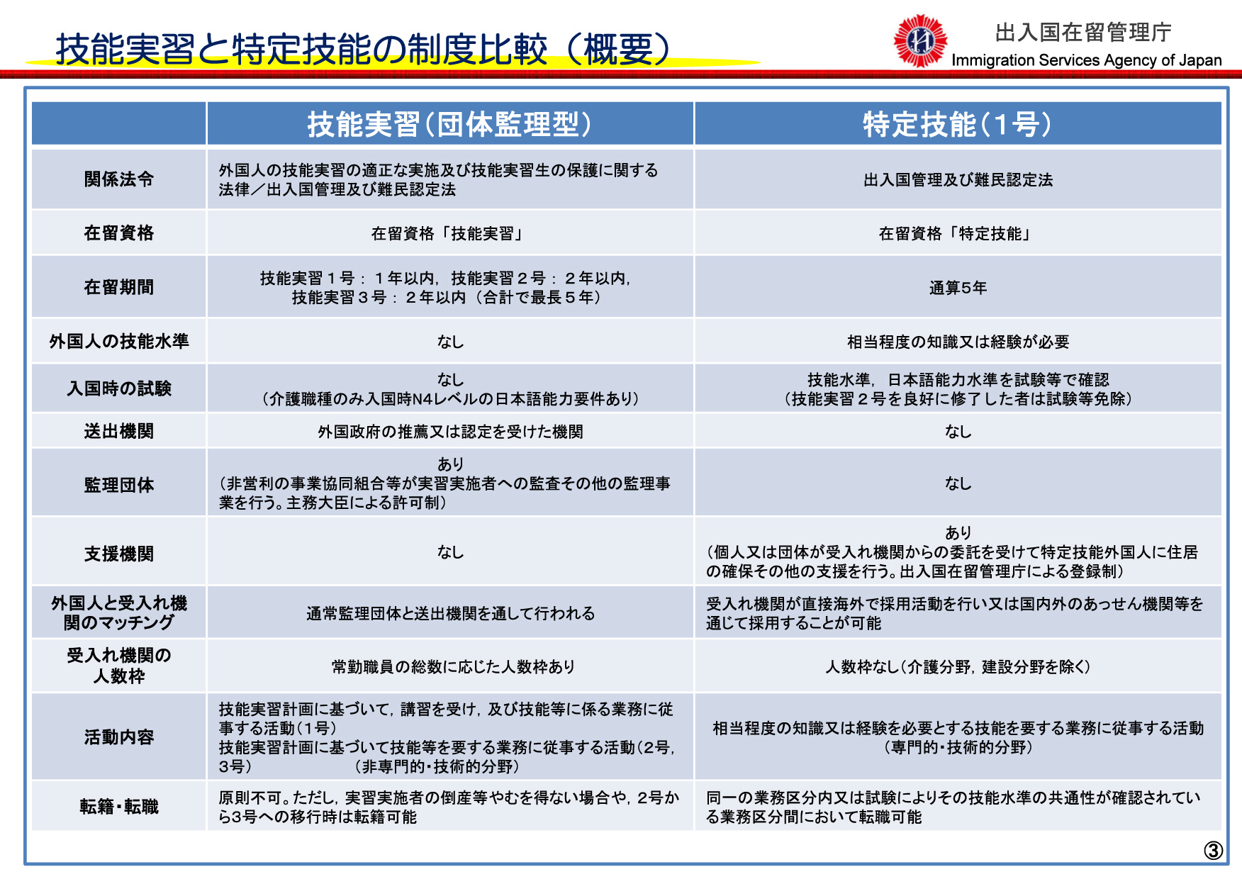 | 技能水準 | 試験等で確認(技能実習2号修了者は試験等免除) |