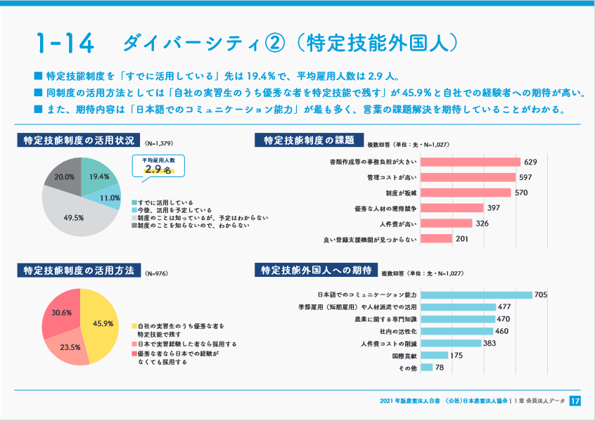 農業法人における特定技能制度の活用状況や運用上の課題等についての調査を実施しております。直近では令和3年11月に2,068 先の当協会会員を対象に「2021 年度農業法人実態調査」を実施しており、結果は以下のとおりとなっております。