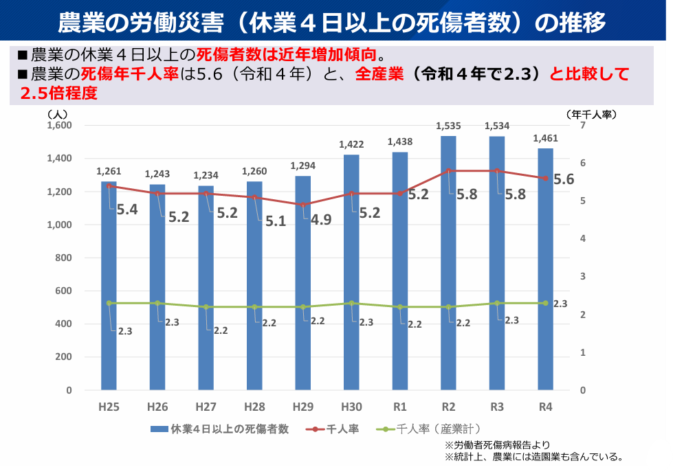 また、農業死亡事故率も高いまま推移しており、農業の労働災害は、全産業の2.5倍程度と高い水準で推移しています。