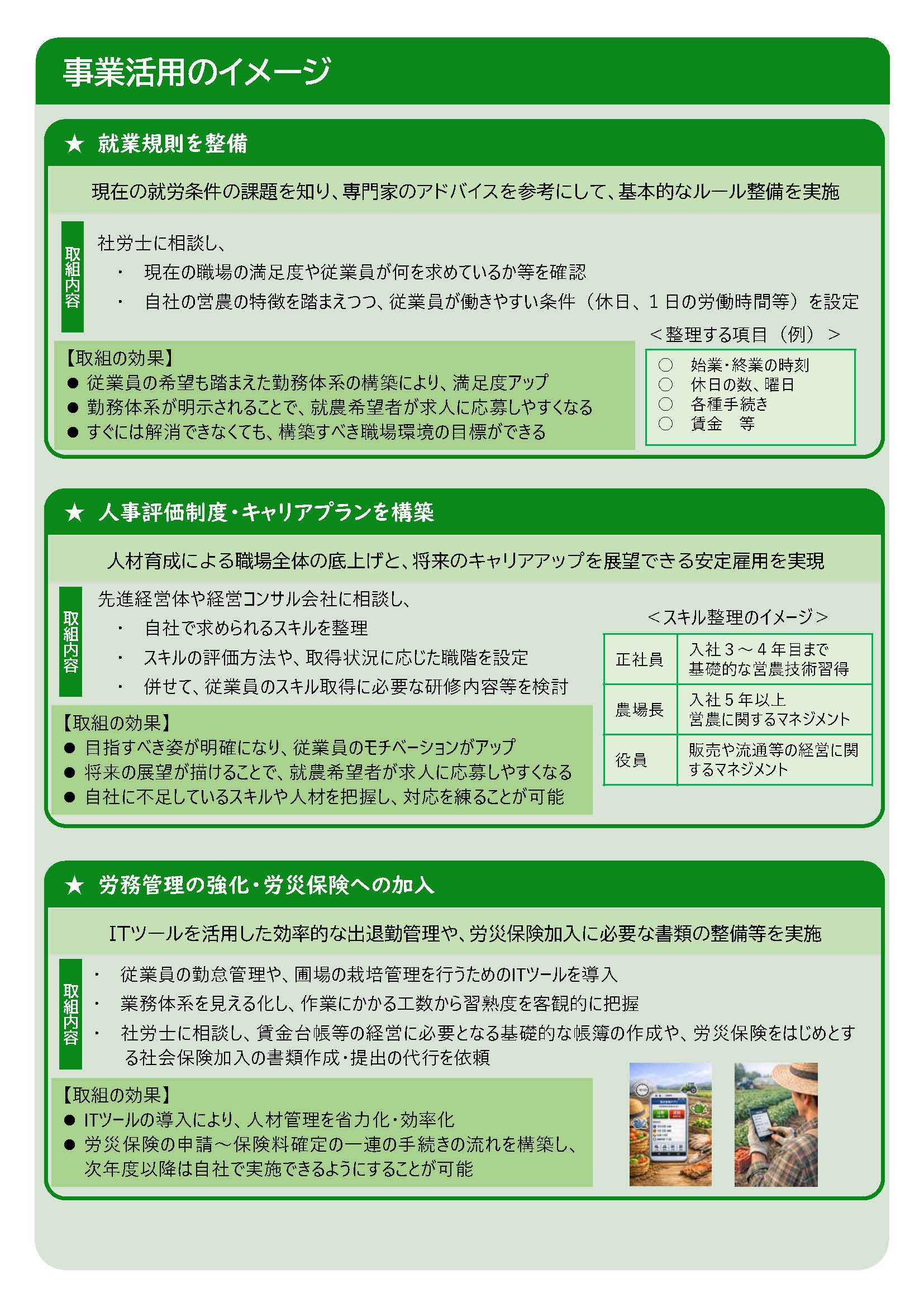 具体的な支援の内容等概要は、農林水産省ホームページ「農業の働きやすい環境づくりについて」をご覧ください。