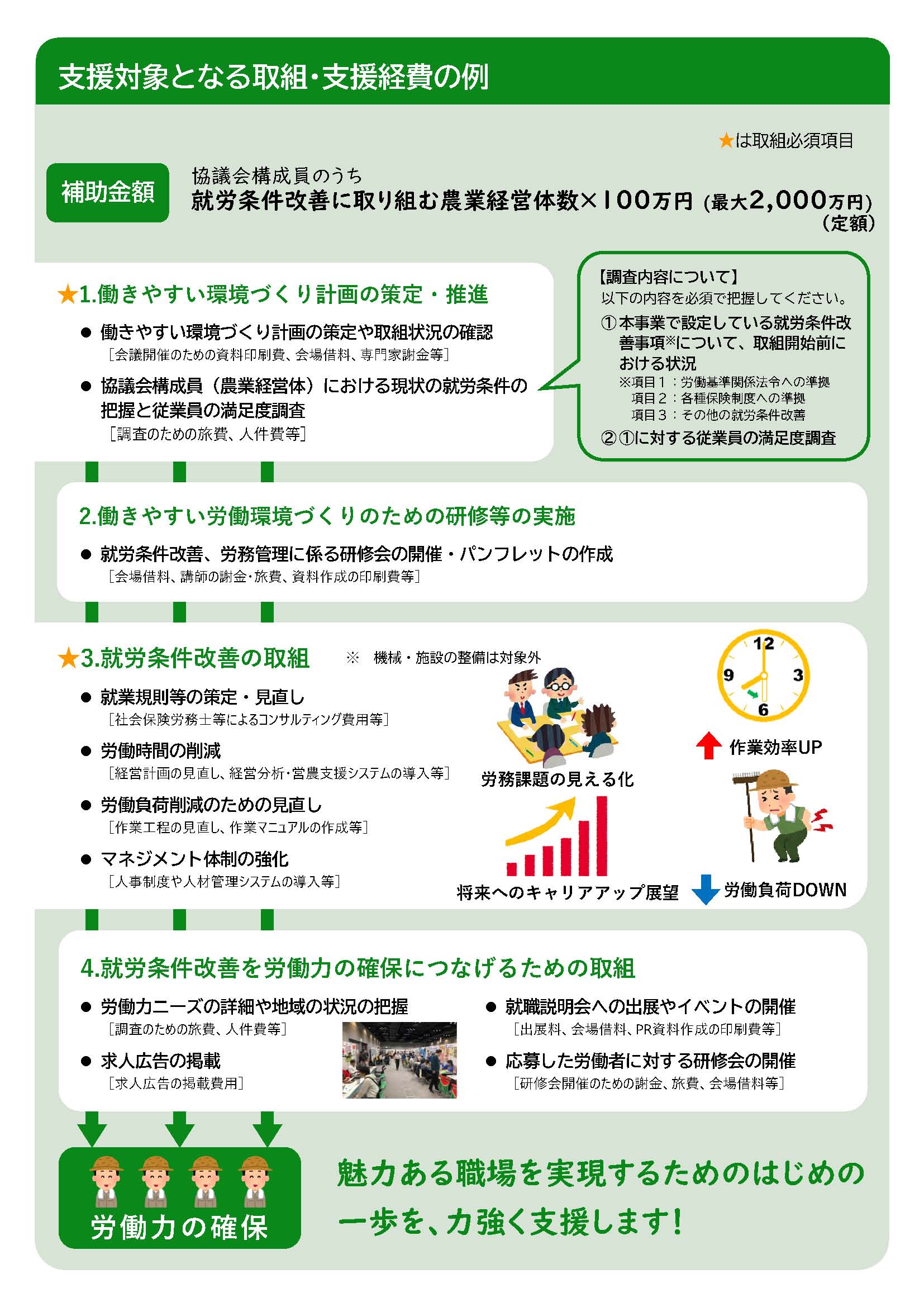 具体的な支援の内容等概要は、農林水産省ホームページ「農業の働きやすい環境づくりについて」をご覧ください。