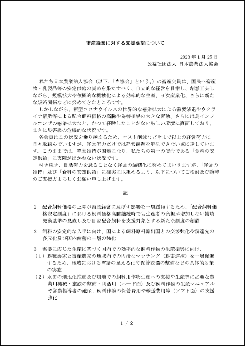 令和5年1月25日(水)公益社団法人日本農業法人協会は、配合飼料価格の高騰や鳥インフルエンザの感染拡大等による、災害級の危機的な畜産経営の状況を受け、当協会の政策提言委員会畜産部会での議論及び当協会の会員に対し実施している全国農業法人実態調査の回答を踏まえ、「畜産経営に対する支援要望」を農林水産省に提出しました。