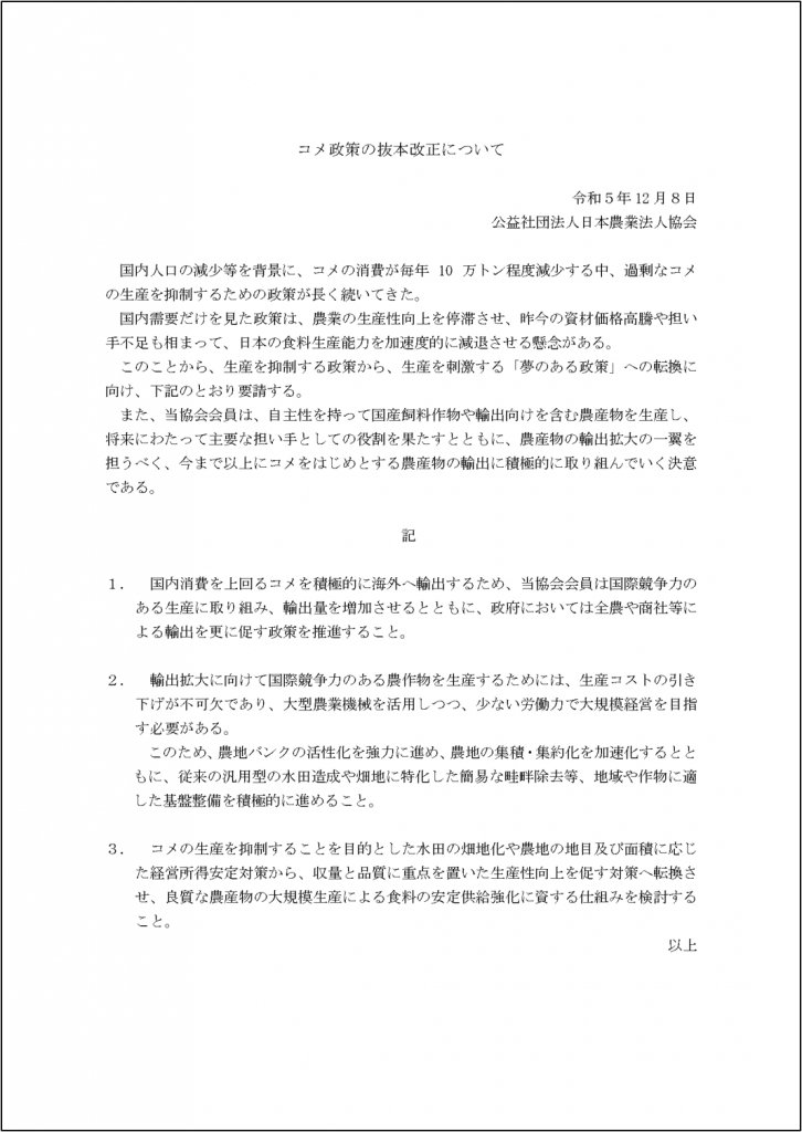 【12月8日(金)】意見書「コメ政策の抜本改正について」の公表について