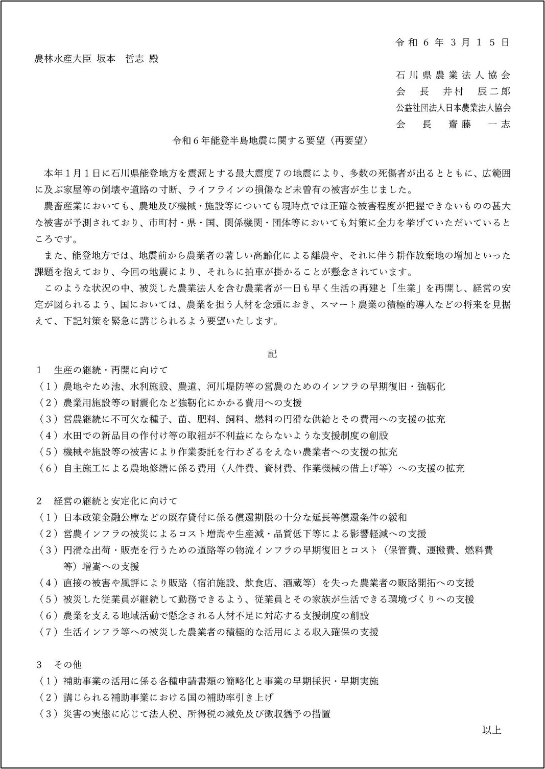 「令和6年能登半島地震に関する緊急要望(再要望)」(全文)