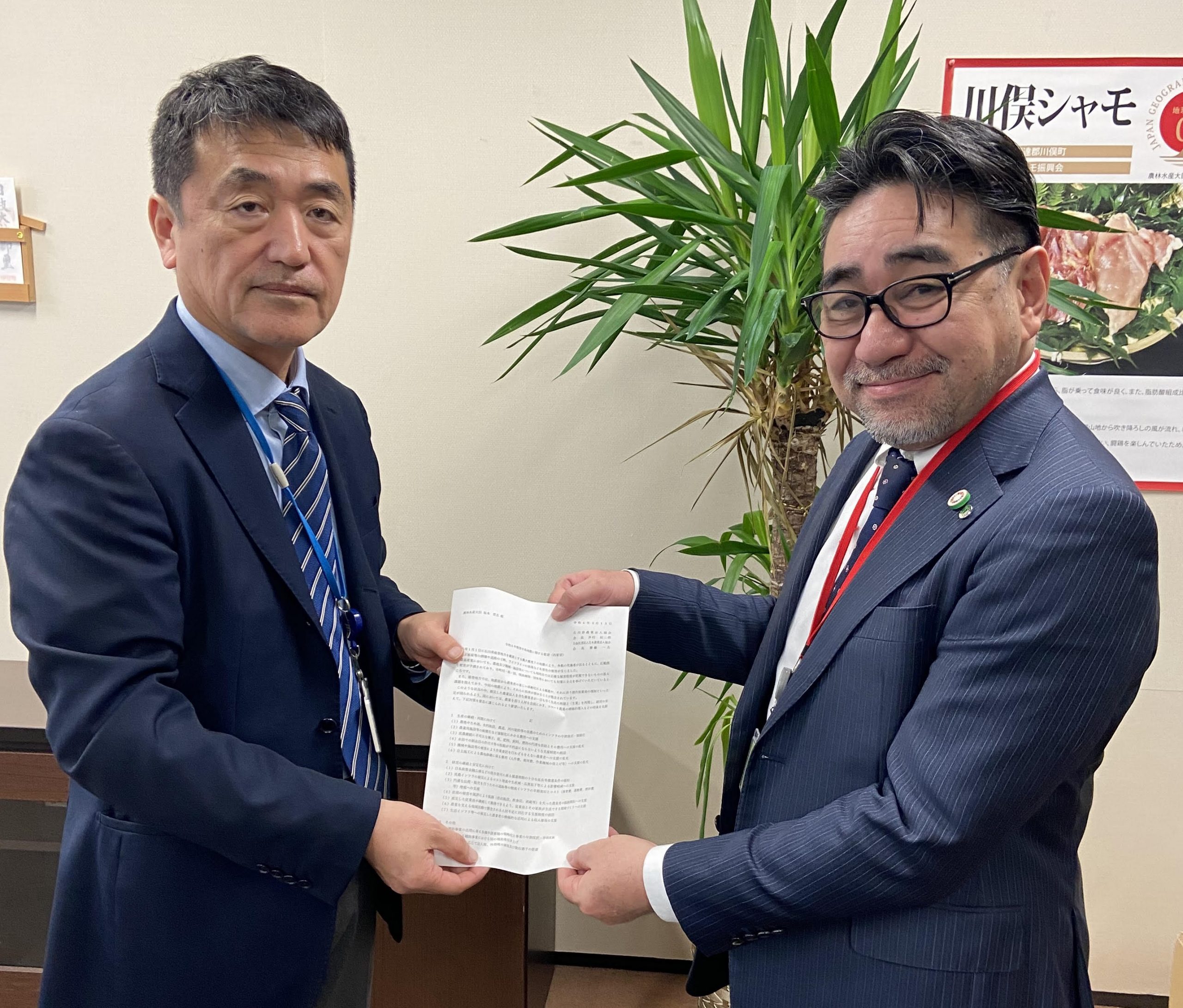 公益社団法人日本農業法人協会(以下、「当協会」という。)は、石川県農業法人協会と連名で令和6年3月15日(金)に「令和6年能登半島地震に関する緊急要望(再要望)」を石川県農業法人協会会長 兼 当協会副会長 井村辰二郎より、農林水産省大臣官房 松尾浩則危機管理・政策立案総括審議官に手交しました。