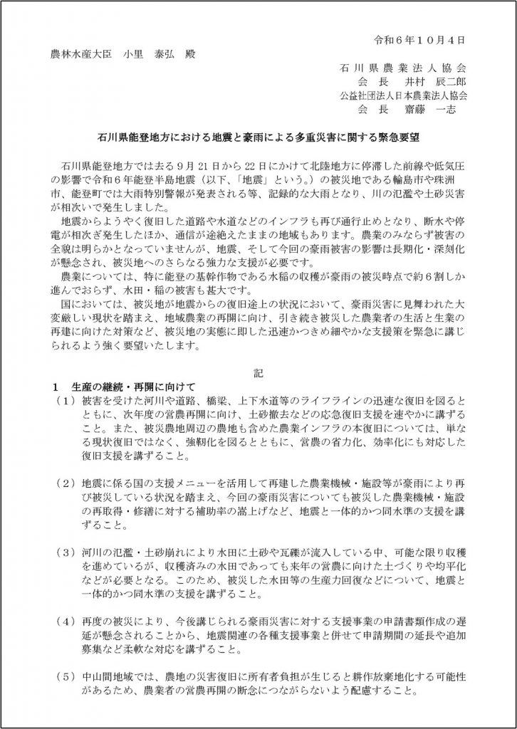 公益社団法人日本農業法人協会(以下、「当協会」という。)は、石川県農業法人協会と連名で令和6年10月4日(金)に「石川県能登地方における地震と豪雨による多重災害に関する緊急要望」を石川県農業法人協会会長 兼 当協会副会長 井村辰二郎及び、当協会専務理事 紺野和成より、農林水産省大臣官房 谷村栄二危機管理・政策立案総括審議官に手交しました。