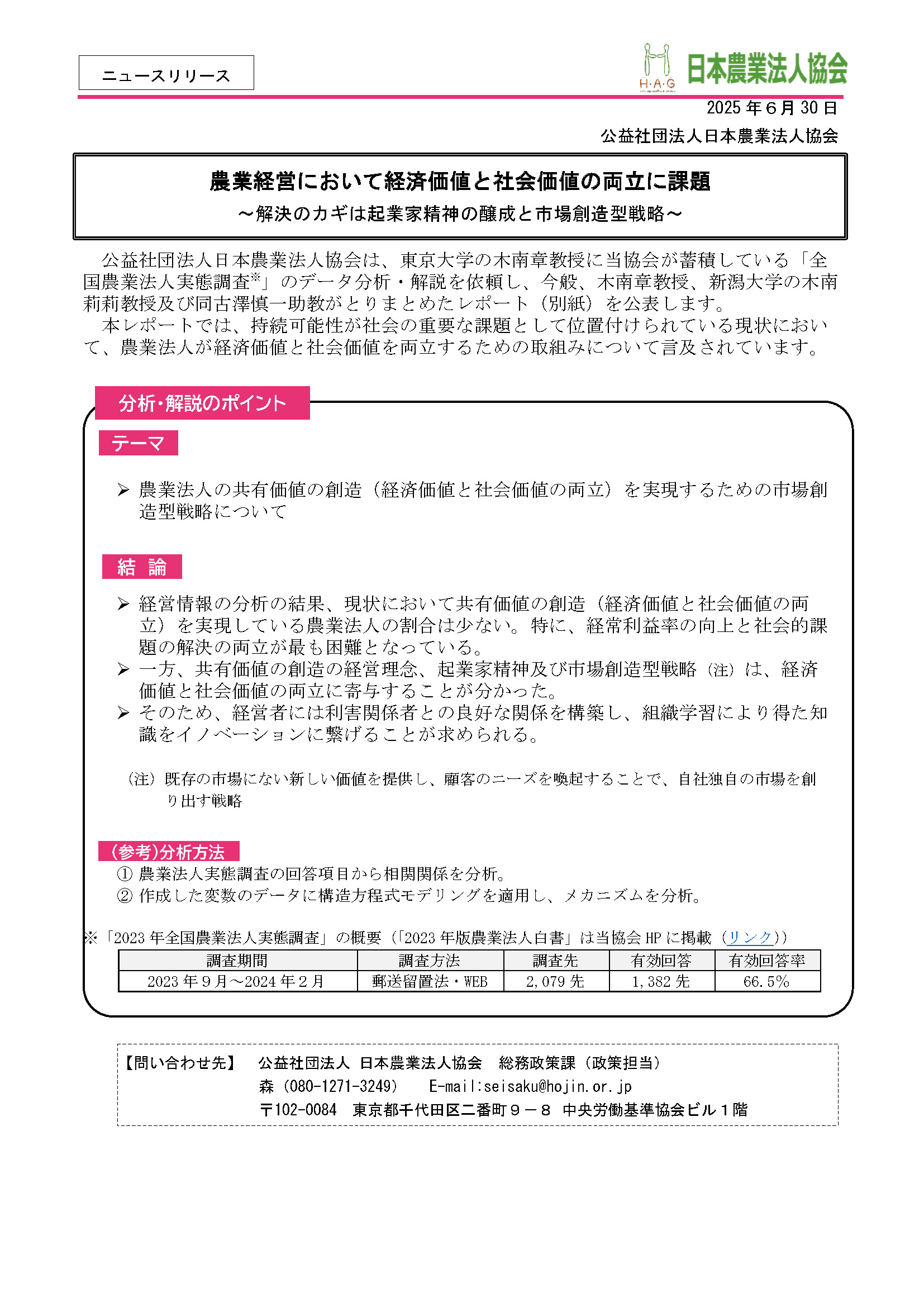 公益社団法人日本農業法人協会は、東京大学の木南章教授に当協会が蓄積している「全国農業法人実態調査」のデータ分析・解説を依頼し、今般、木南章教授、新潟大学の木南莉莉教授及び同古澤慎一助教がとりまとめたレポートを公表します。