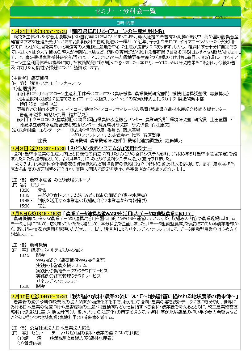 今回も昨年と同様、基調講演以外は全てオンライン開催としており、専用サイト上で 約1ヵ月半に渡り開催します。内容に関しては、先進的な技術・サービス等を紹介するとともに、農研機構の会場(オンライン併用)で行う「基調講演」や、①イヤコーンの生産技術 ②WAGRIの活用 ③地域計画 ④みどりの食料戦略等の重要課題について「4つの分科会」をオンラインにてそれぞれ実施することとしています。