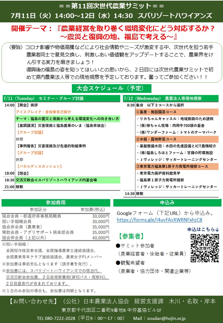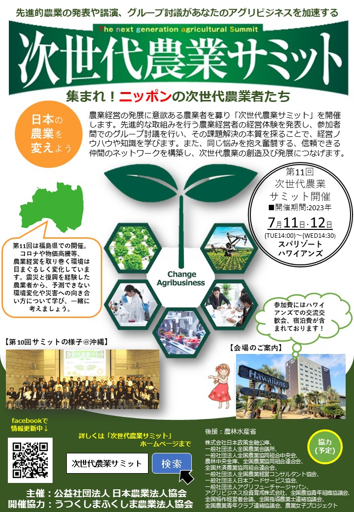 第11回 次世代農業サミットを開催します!(2023/7/11(火)~12(水)@福島)